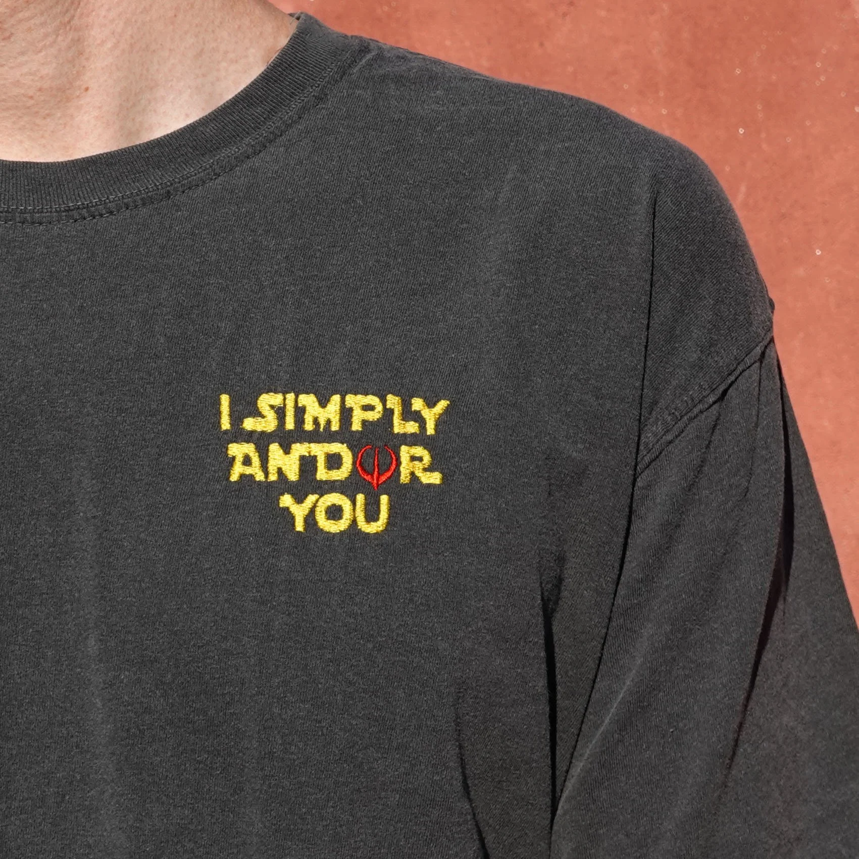 White men’s polo shirt (read: slightly larger than women’s sizing), machine-embroidered.