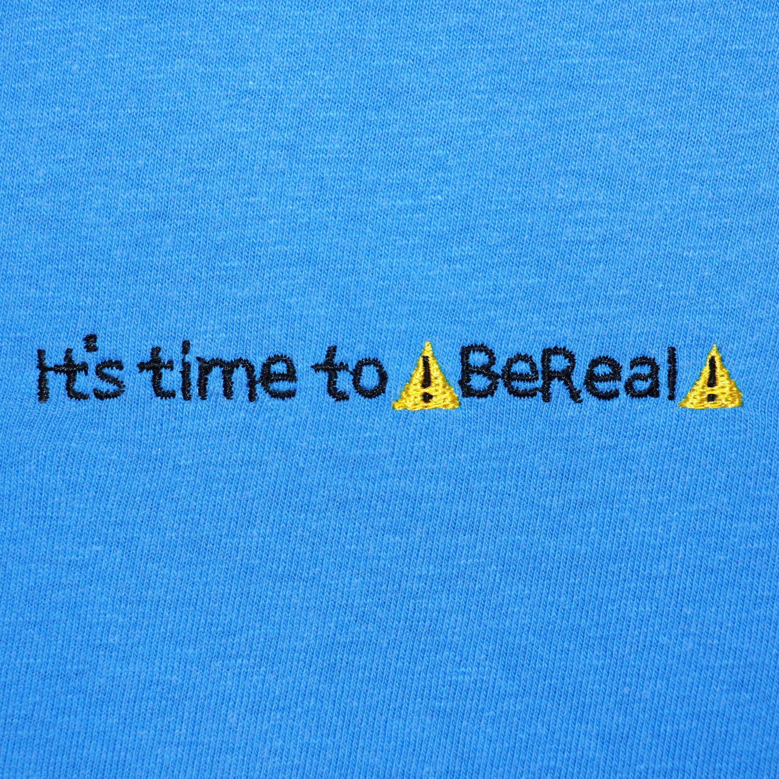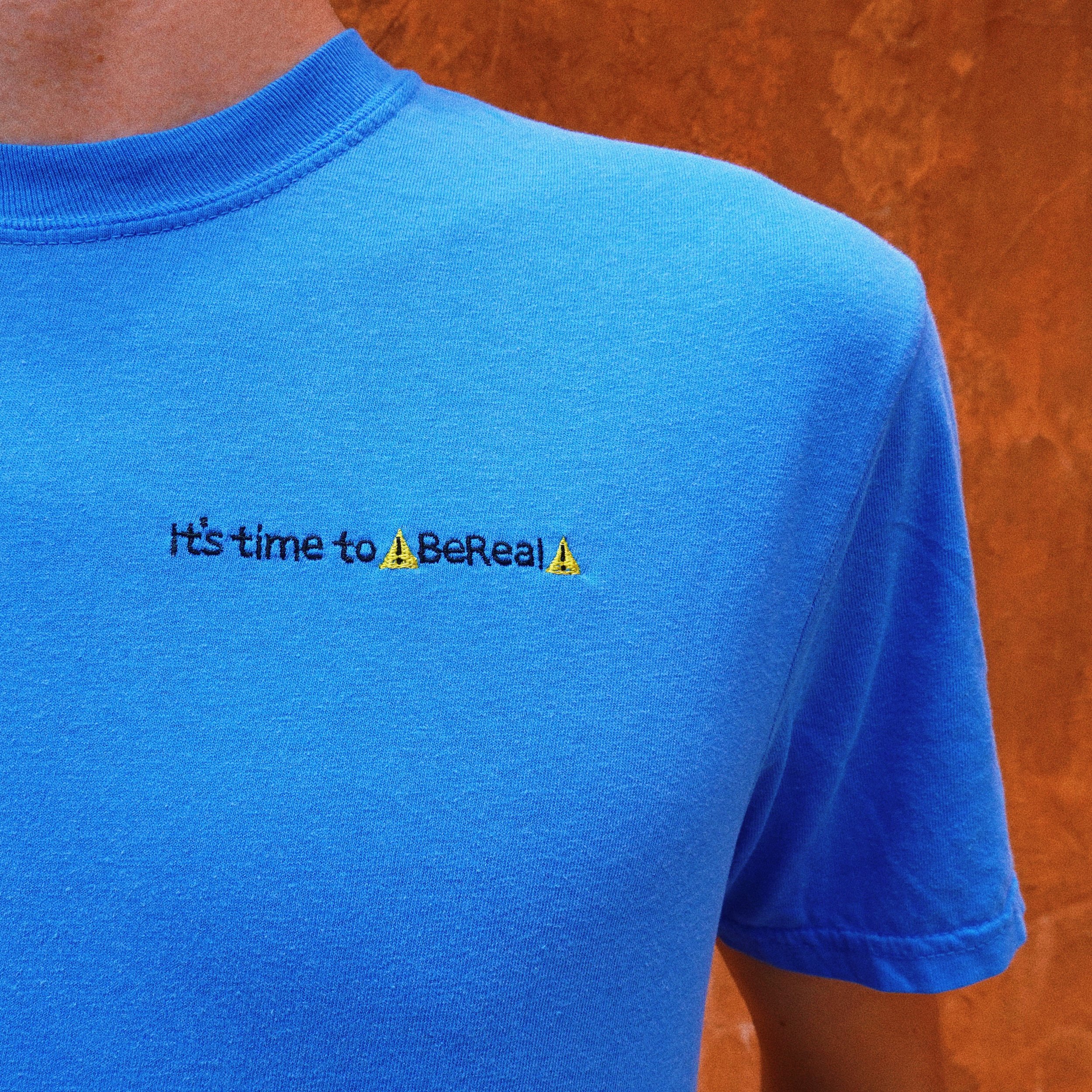 Blue unisex T-shirt, machine-embroidered. Size + care guide.
