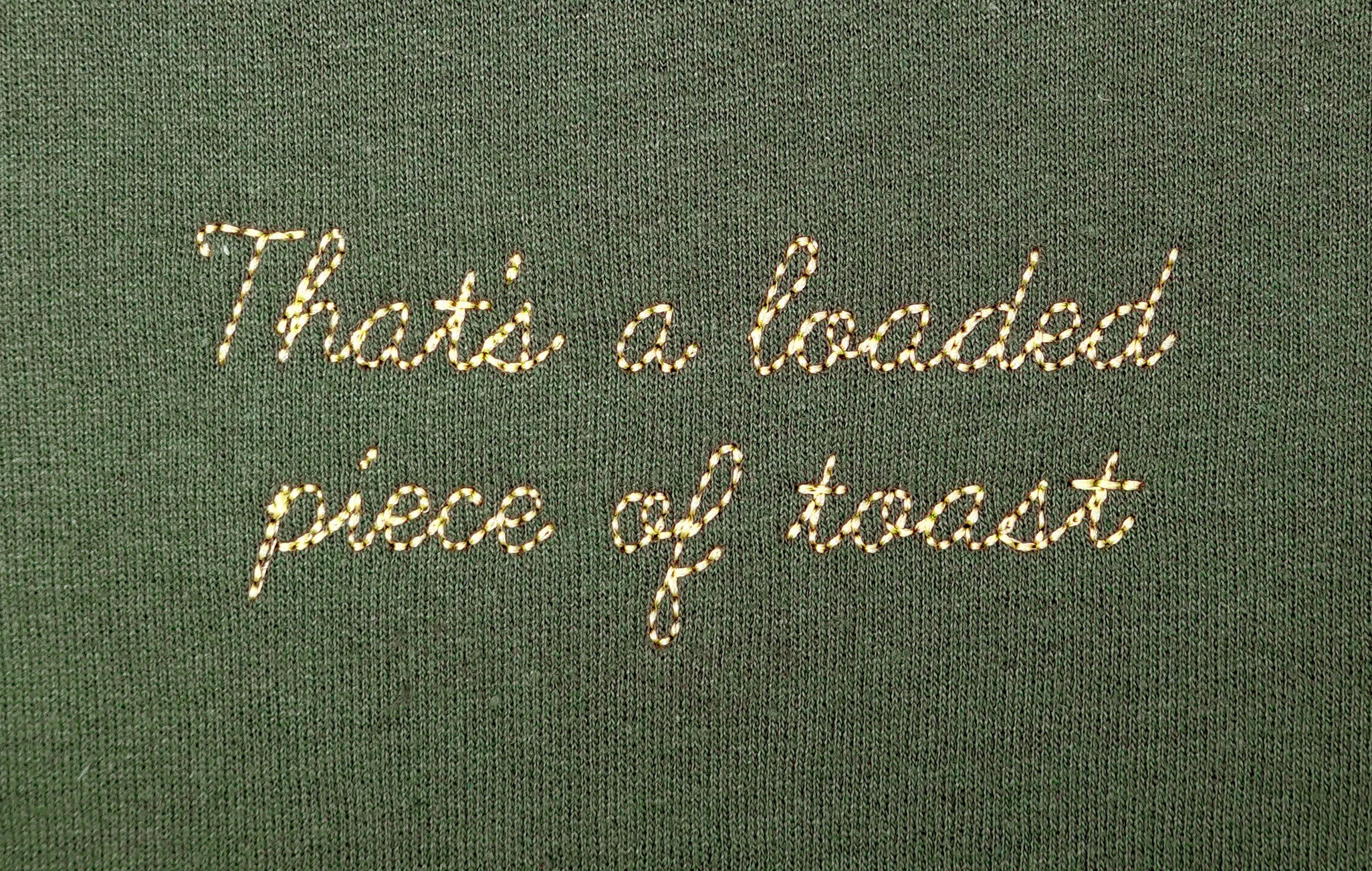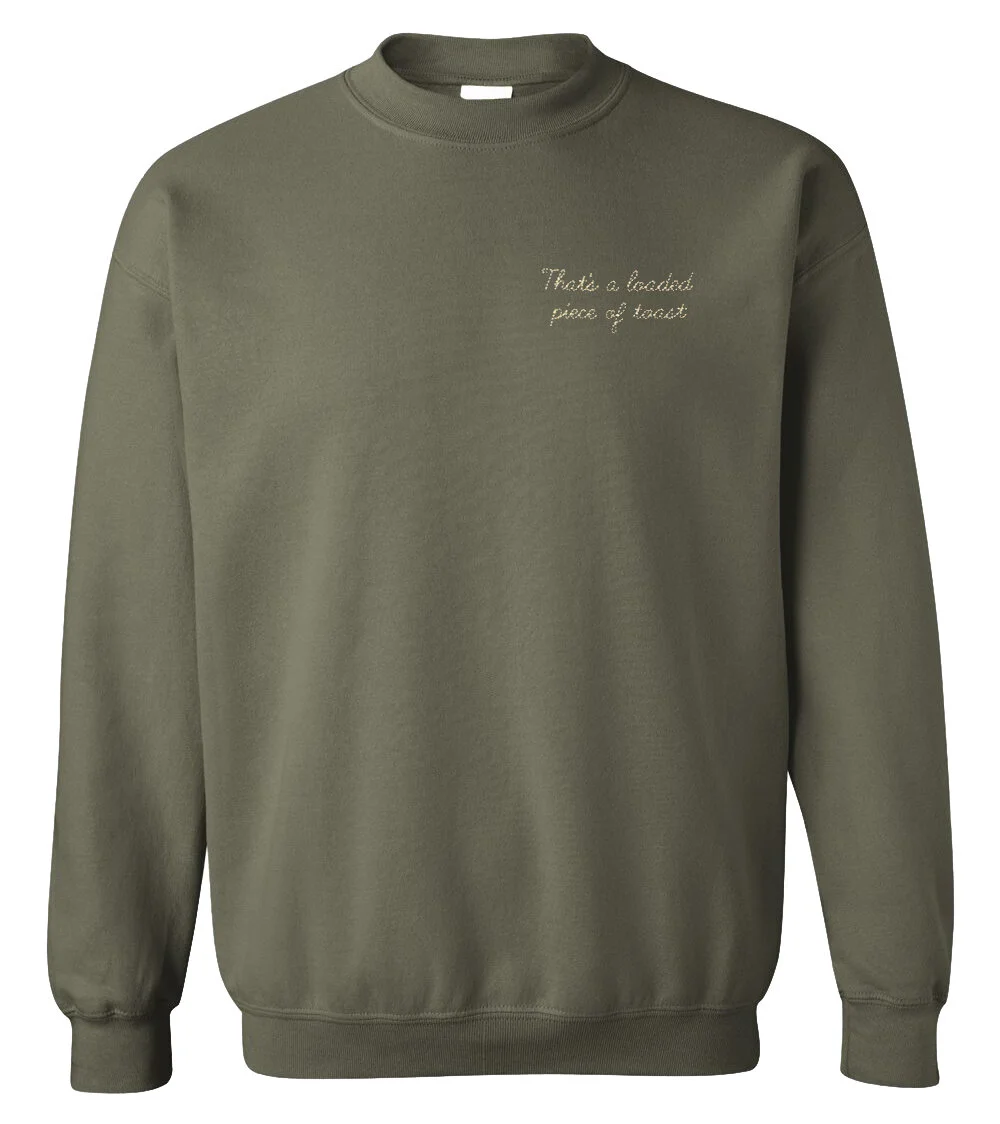 Green unisex sweatshirt, machine-embroidered. Size + care guide.