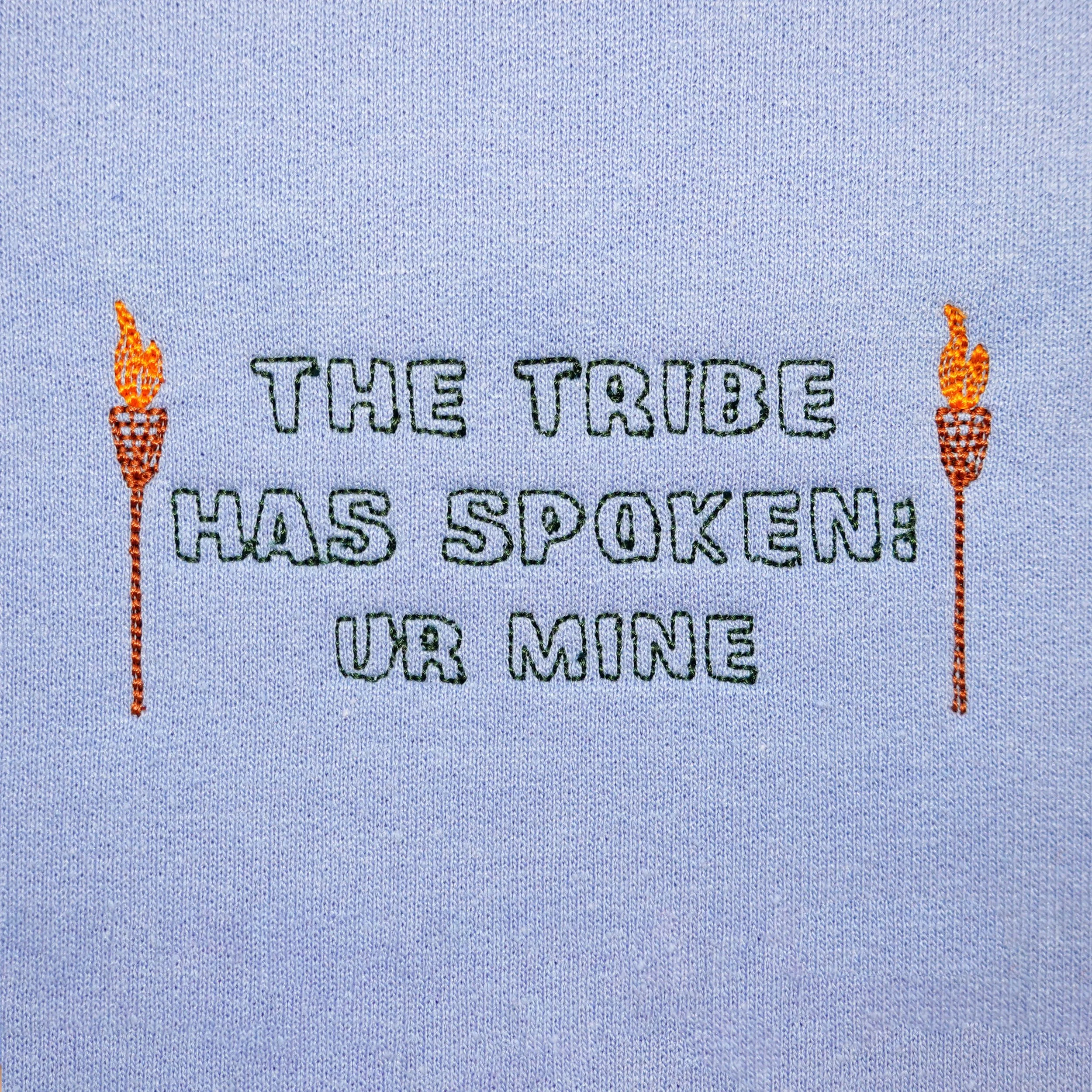 Blue unisex sweatshirt, machine-embroidered. Size + care guide.