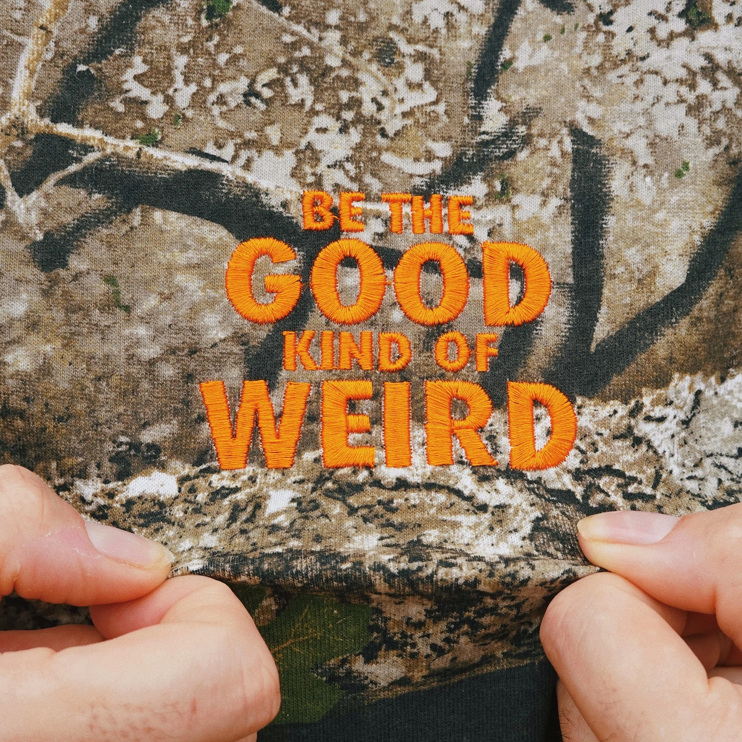 Black and metallic gold thread on a pepper grey unisex T-shirt, machine-embroidered. Size + care guide.